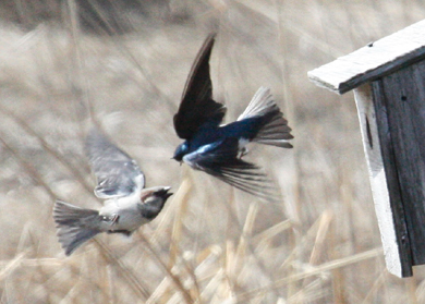 So swallows are what we might consider non-traditional, seeking out and making nests in places that might not be the “first choice” of other birds. Whereas sparrows usually find traditional nesting places, but are quite opportunistic and will take away a nest from a swallow.