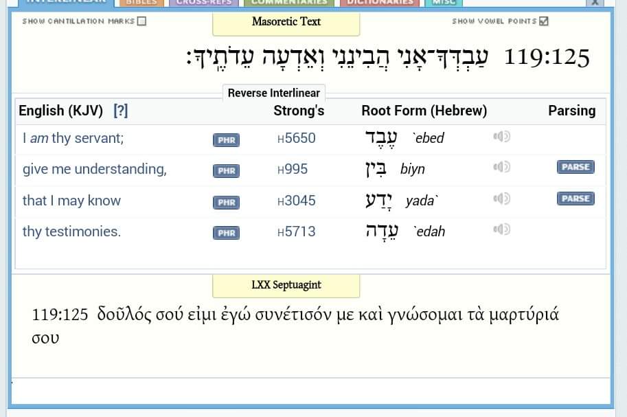 עַבְדְּךָ־אָ֥נִי הֲבִינֵ֑נִי וְ֝אֵדְעָ֗ה עֵדֹתֶֽיךָ׃