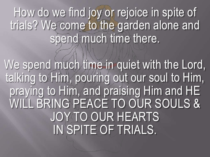 Surrender, and return to the garden, and be still and know that He is God. He is mighty. Trust in Him. Follow Him. He went through hardships. He was wrongly accused and hated by those he pleaded for on their behalf. He faced opposition repeatedly from the enemy that wanted to hinder his work going forth and seeing many bright into freedom and belief and life abundant no longer bound by sin and death. Don’t think that you should escape the trials, but realize that the trials are the refining fires that purify your heart and that service as your living testimony that He lives in you.