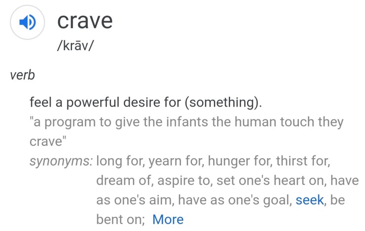 I don’t say this to self denigrate or deprecate — but so that we might consider and agree to the “intensity” that is understood in the word “crave”. And I believe that even a small child watching Sesame Street can appreciate this shared experience of what it means to “crave” something, as they watch Cookie Monster saying, “Me want cookie! Me eat cookie!” and lose control of himself attacking the cookies with a voracious “Nom, nom, nom.”