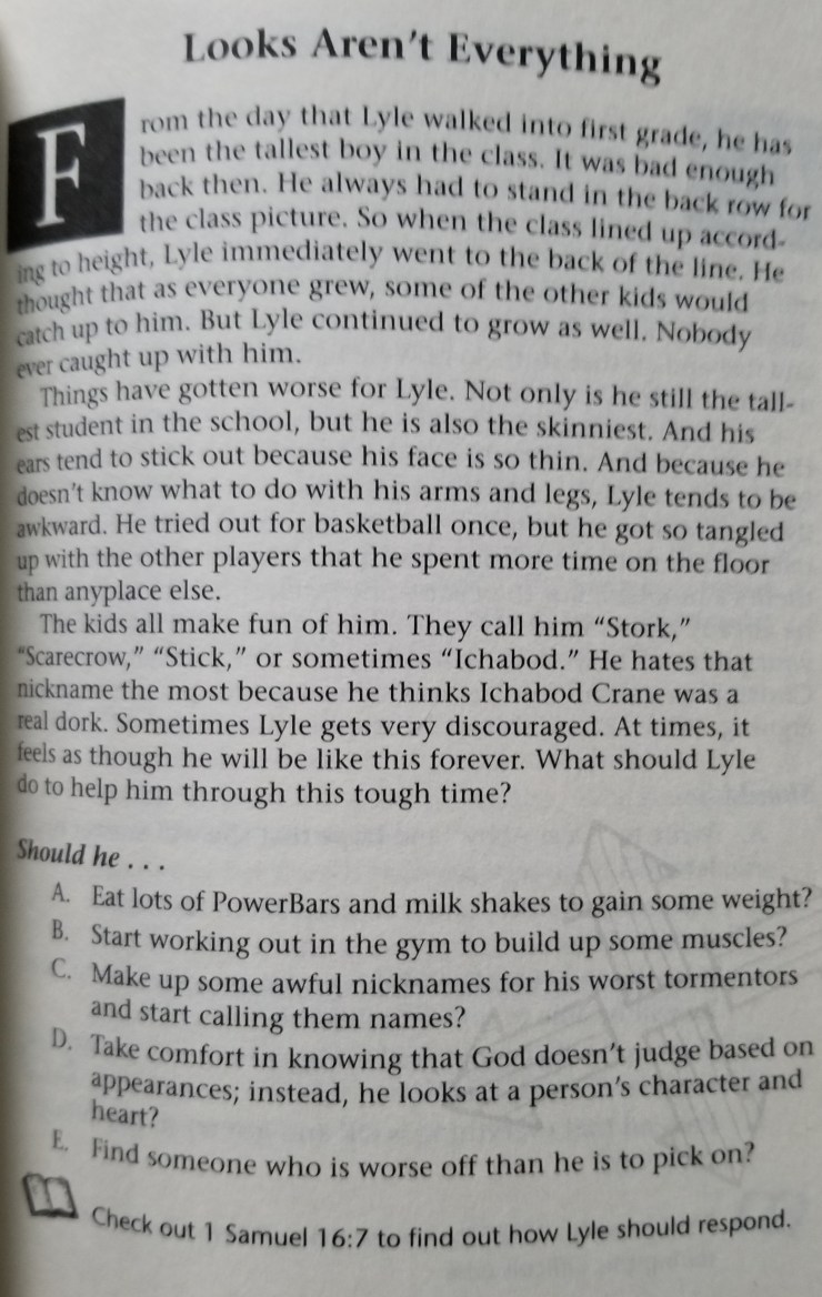 But the Lord said to Samuel, “Don’t judge by his appearance or height, for I have rejected him. The Lord doesn’t see things the way you see them. People judge by outward appearance, but the Lord looks at the heart.”