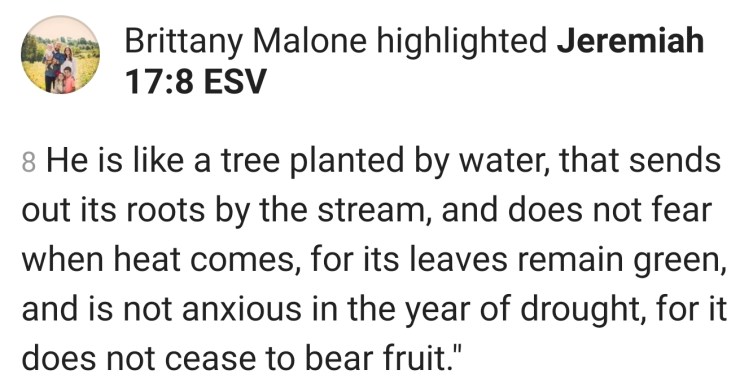 This morning, I noticed this verse in the Bible app that Brittany Malone had highlighted, and it is so perfect for a season of challenge: