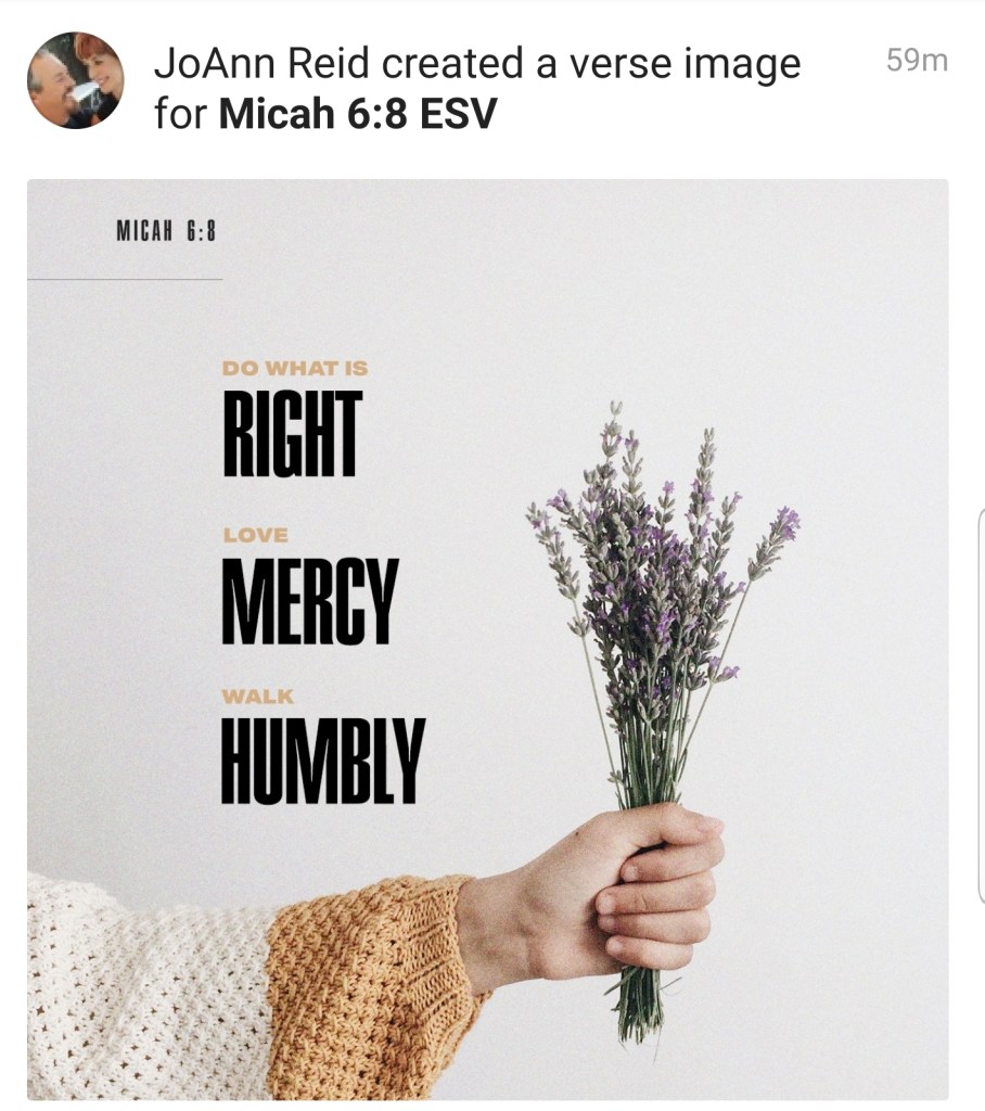 I was reminded this morning of Micah 6:8 by a verse image that JoAnn Reid created on the Bible app: