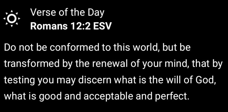 Don’t copy the behavior and customs of this world, but let God transform you into a new person by changing the way you think. Then you will learn to know God’s will for you, which is good and pleasing and perfect.