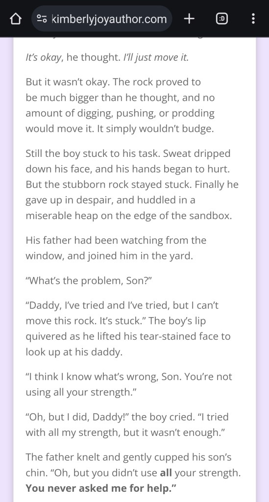 I let him know that this story was helpful to me and I shared the link: https://kimberlyjoyauthor.com/using-all-your-strength/