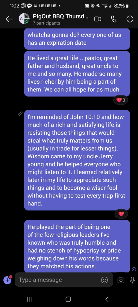 As I reflect on the recent passing of my Uncle Jerry Ford, who was a wonderful man of God — I remember what I sent to my coworkers in our “PigOut BBQ Thursdays” chat group on Microsoft Teams as I headed to the funeral: