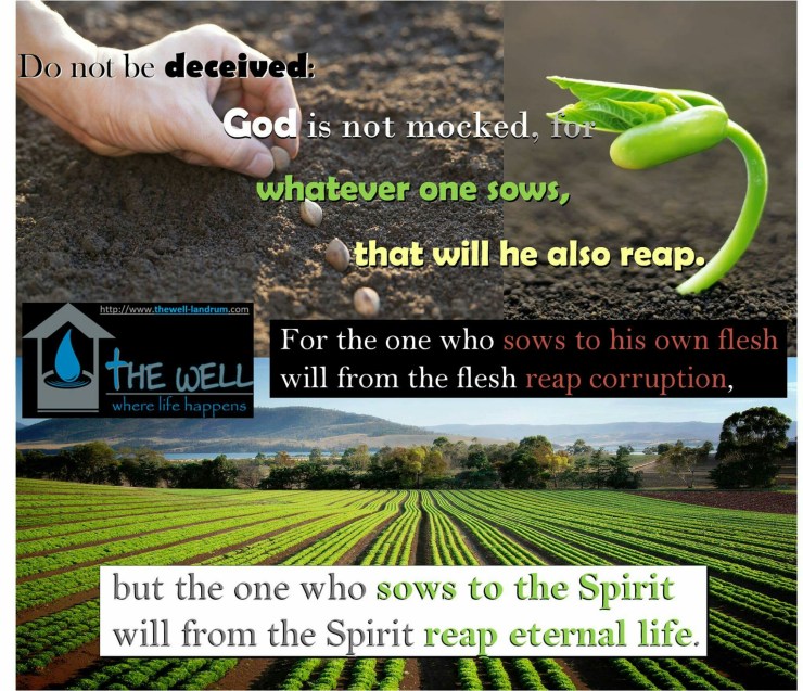 Do not be deceived: God is not mocked, for whatever one sows, that will he also reap. For the one who sows to his own flesh will from the flesh reap corruption, but the one who sows to the Spirit will from the Spirit reap eternal life. And let us not grow weary of doing good, for in due season we will reap, if we do not give up. So then, as we have opportunity, let us do good to everyone, and especially to those who are of the household of faith. – Galatians 6:7‭-‬10 ESV